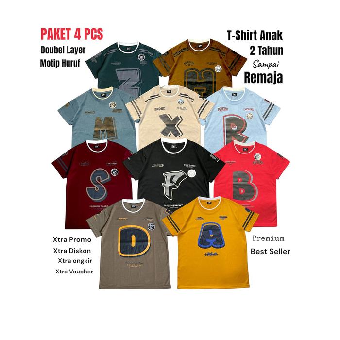 4 PCS KAOS ANAK MOTIP HURUF ABJAD LENGAN PENDEK USIA 2 TAHUN SAMPAI REMAJA BAHAN SEMI KATUN ADEM DISTRO FASHION - 4 PCS