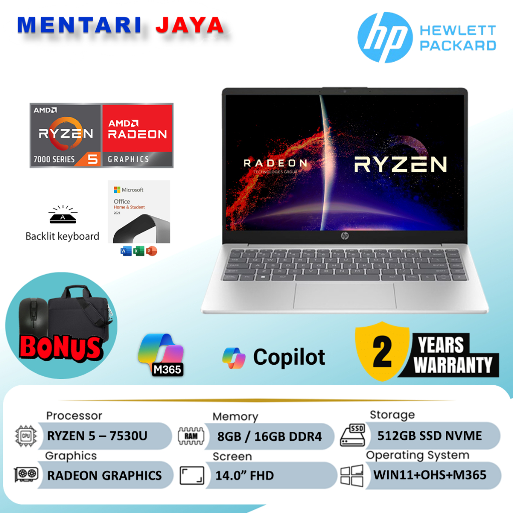Laptop HP 14 Ryzen 5 7530U RAM 16GB SSD 512GB 14.0 Inch FHD Windows 11 Home