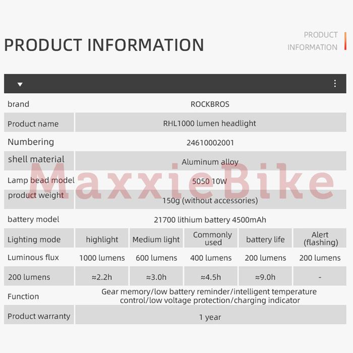 Rockbros Rhl 1000 Lampu Depan Senter Sepeda Bicycle Front Light Led 1000Lm Outdoor - Black