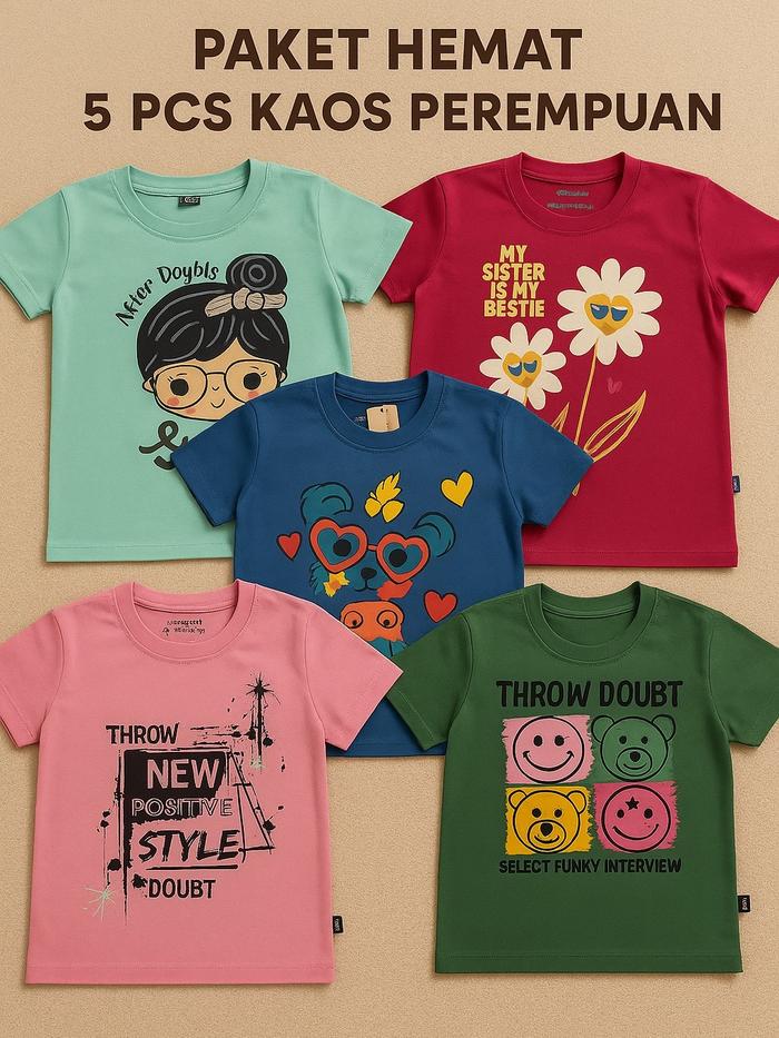 GIGGLENEST KIDSWEAR PAKET HEMAT 5PCS KAOS ANAK PEREMPUAN MOTIF RANDEM BAHAN KAOS CATTON COMBET 30S - PAKET HEMAT 5PCS RA