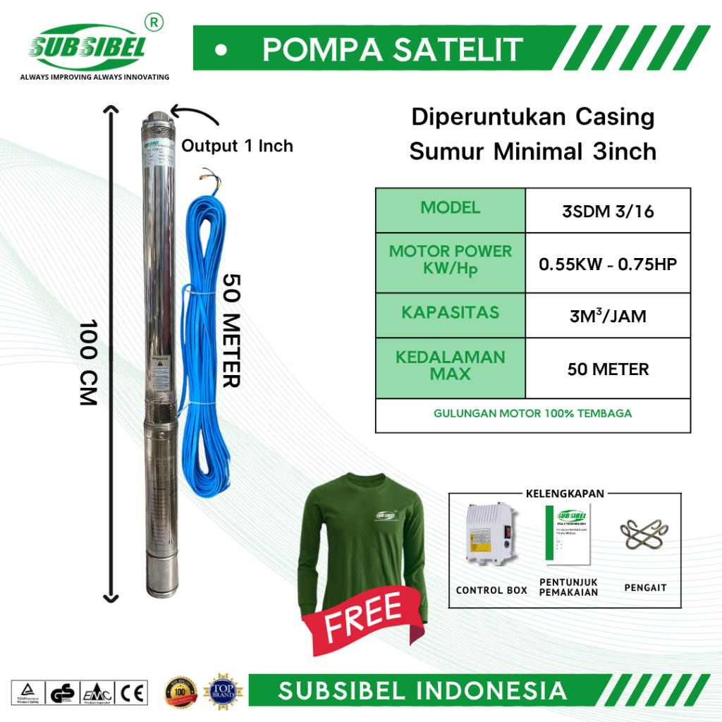 POMPA AIR POMPA SUBMERSIBLE 3SDM 3/16 - 0.75HP + KABEL 50 METER -SUBSIBEL INDONESIA