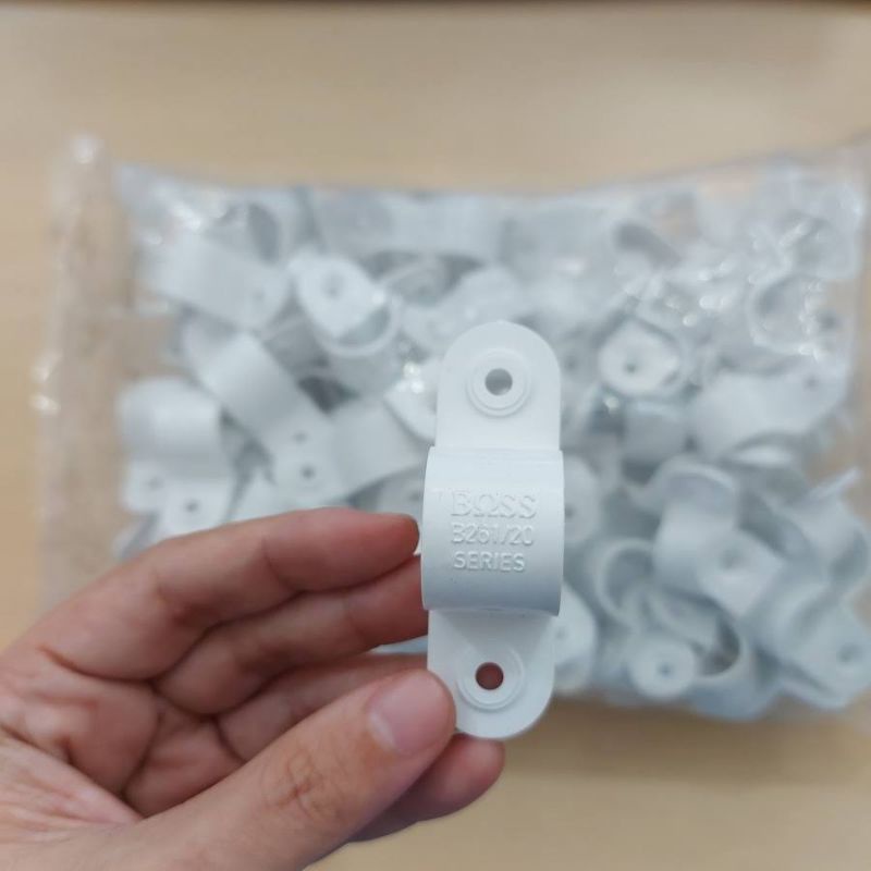 Klem Pipa Boss 20Mm Putih / Klem Boss 20Mm Putih / Klem Boss / Klem Pipa Listrik / Klem Pipa Boss Isi 100Pcs / Klem Pipa
