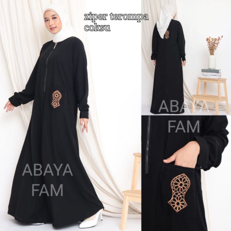 Abaya Hitam Turkey Gamis Maxi Dress Arab Saudi Bordir Turki Dubai Ziper Terompa Saku