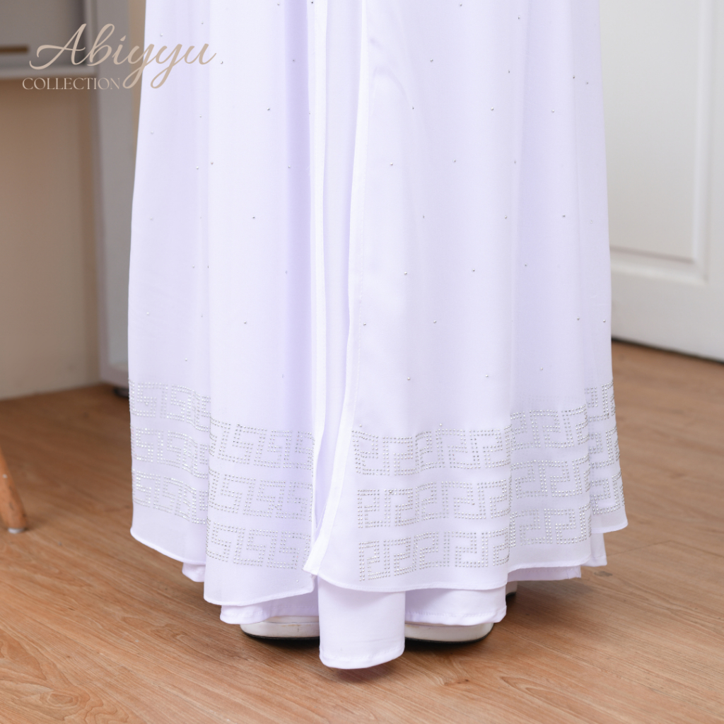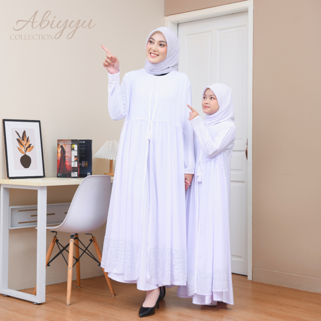 Abaya Turki Hitam Putih Couple Ibu dan Anak Perempuan Baju Gamis Turkey Remaja Tanggung Bahan Jersey mix Ceruty dengan Mote Silver, Dan Gold Mewah