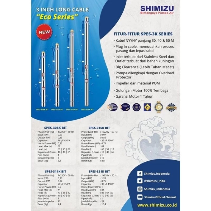 POMPA AIR SATELIT SHIMIZU SPES-308K BIT 0.33 HP + KABEL /POMPA SUBMERSIBLE 1/3 HP 3 INCH