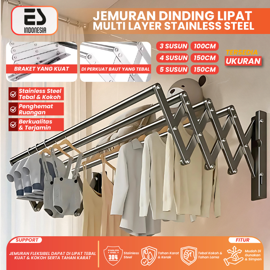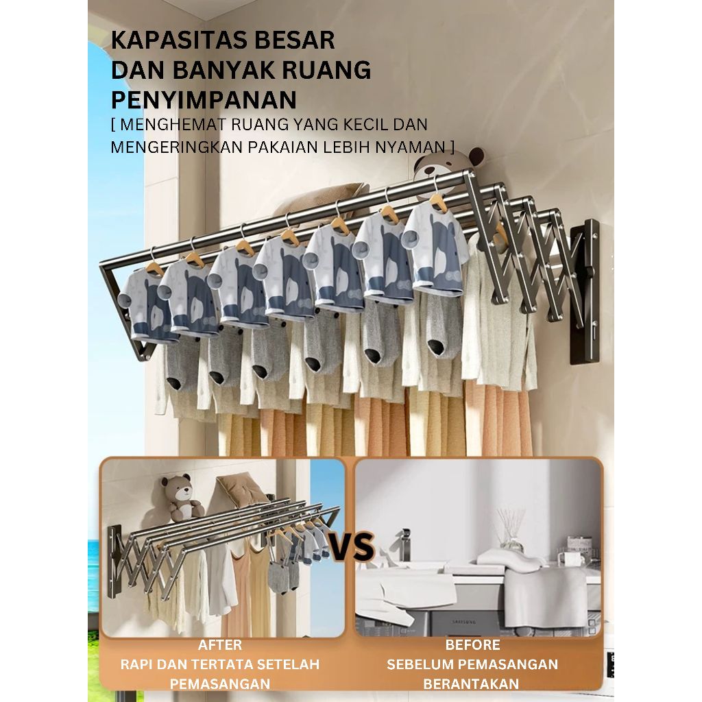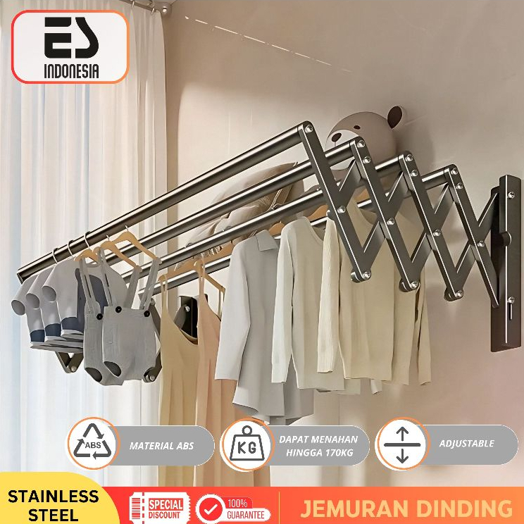 Esindo Jemuran Baju Tempel Dinding Lipat /Tarik - Rak Jemuran Pakaian Basah Lipat Rak Jemuran Tembok