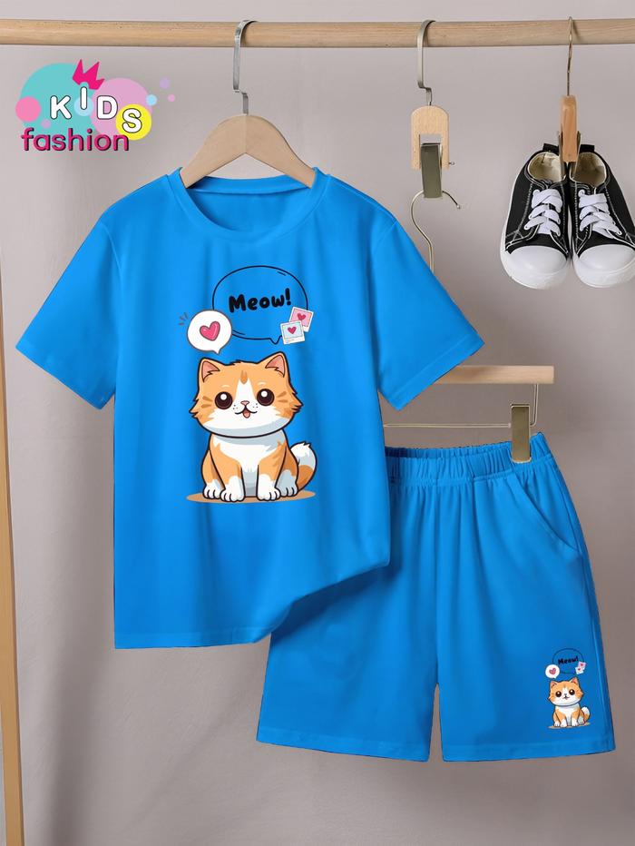 Setelan Anak Laki-Laki / Perempuan Dan Celana Pendek Ukuran 3-10Thn Motif Meow Love Fashion Baju - Salem, S 3-4Thn