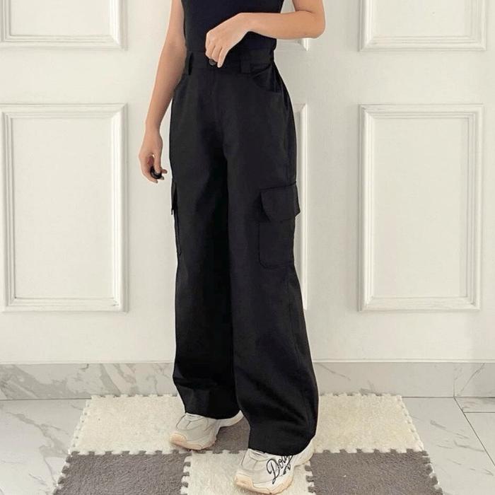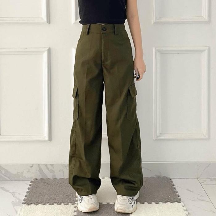 Celana Panjang Cargo Anak Perempuan Kargo Cewek Fashion Korean Loose-Fitting - Hitam, 22 8 Tahun