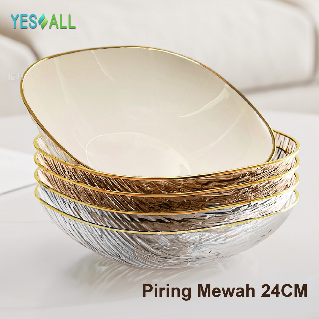 YESALL Piring Saji Kotak Besar 24cm / 20cm Ripple Transparan Mewah Pinggiran Emas – Untuk Buah, Lauk, Salad, Dessert, Sharing Keluarga, Estetik