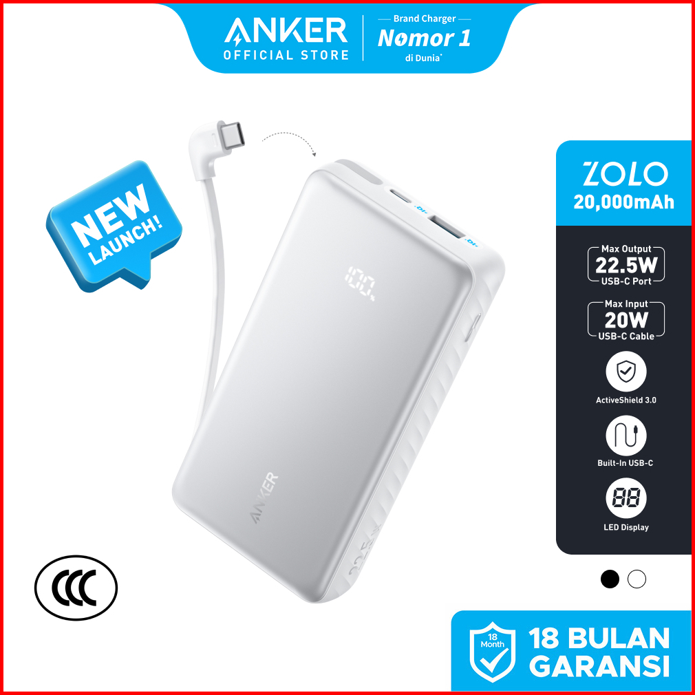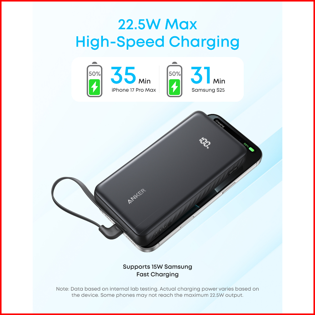 Anker Zolo Portable Power Bank 3c Ccc 20 000mah 3 Ports With Built-in Type-c Cable Type-a Port 22.5w Fast Charging Pd Pp