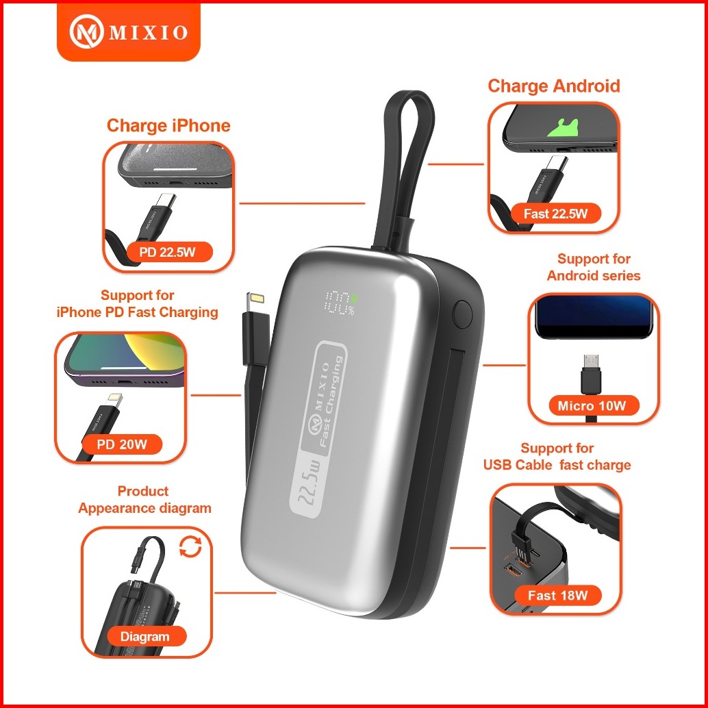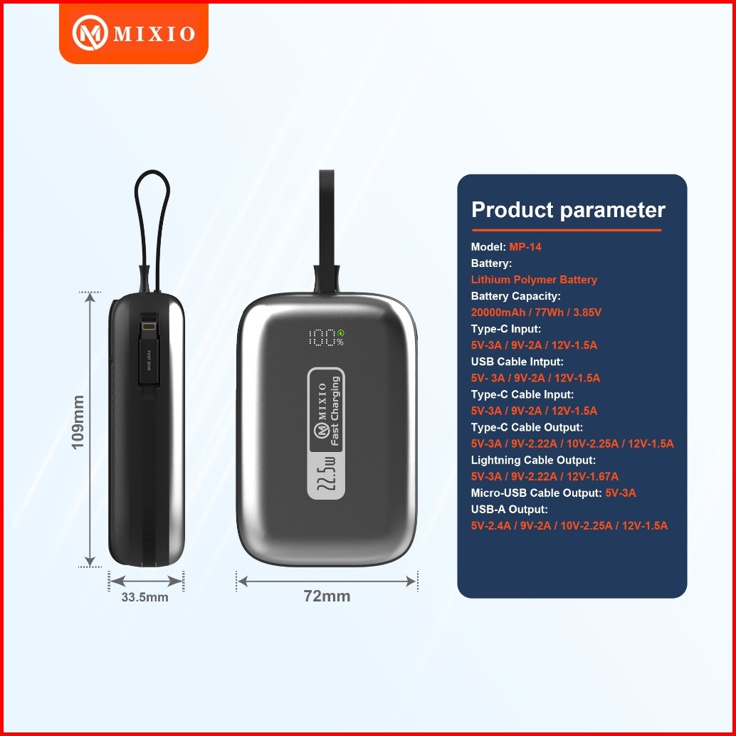 Mixio Mp-14 20000mah Small Size Powerbank 22.5w With Kabel Fast Charging Lightning Type C Micro Usb For Iphone Android