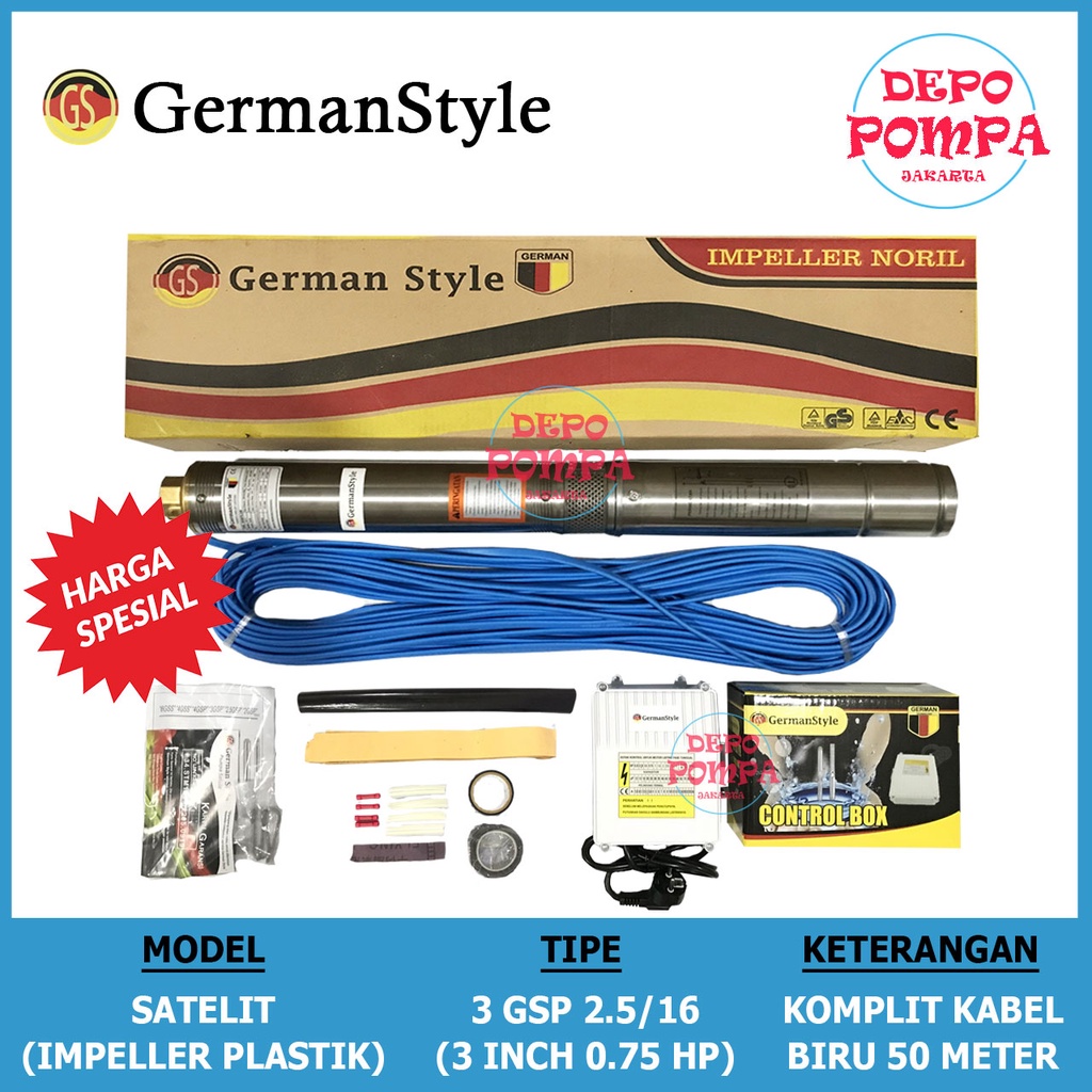 Pompa Satelit GERMAN STYLE 3 INCH 0.75 HP KOMPLIT KABEL BIRU ASLI