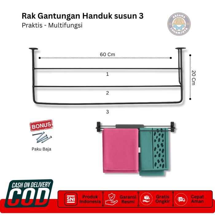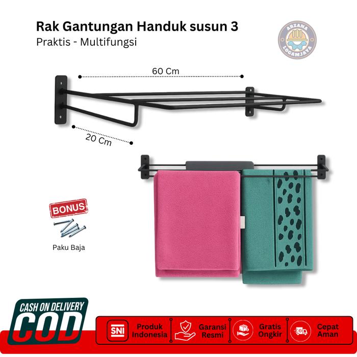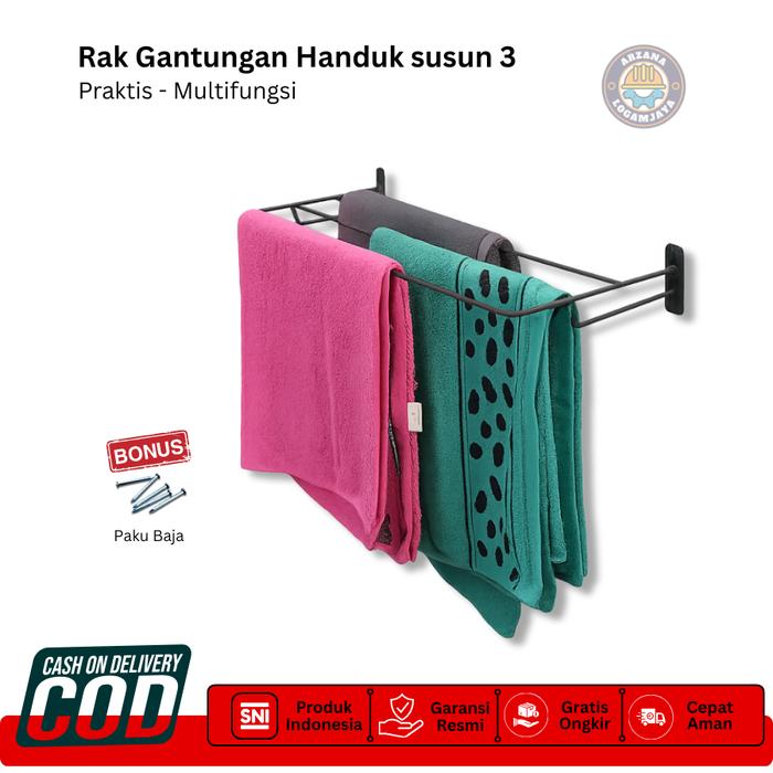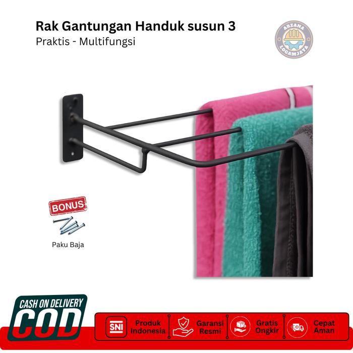 Rak Handuk 3 Susun Minimalis - Gantungan Handuk Payung Jas Hujan Sajadah 3 Baris Tempel Dinding Tanpa Bor Baja Besi Taha