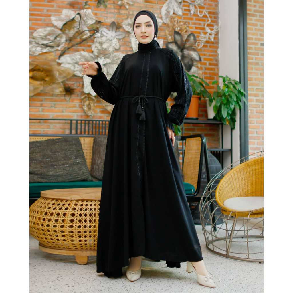 Abaya premium set kerudung pasmina resleting full bisa jadi outer jetblack wolpich dubai terbaru