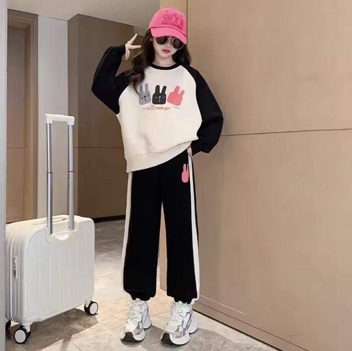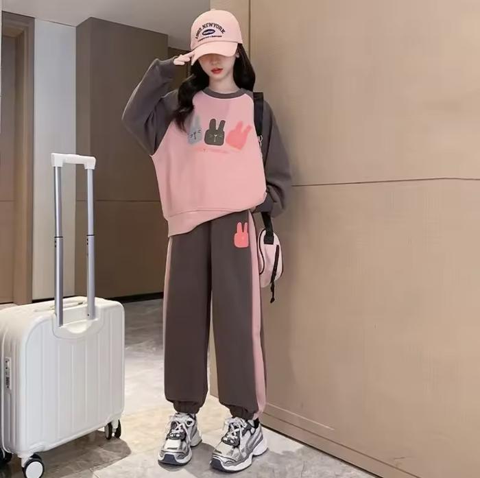 Setelan Anak Perempuan Lovely Sweater Set Celana Jogger Fashion Cewe Kids Usia 3-14 Tahun - Pink Kombinasi Coklat, 3-4 T