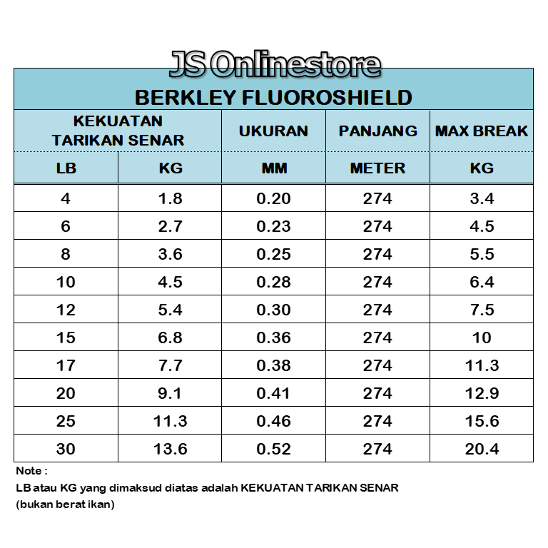 4LB - 0.20mm, 6LB - 0.23mm, 8LB - 0.25mm, 10LB - 0.28mm, 12LB - 0.30mm, 15LB - 0.36mm, 17LB - 0.38mm, 20LB - 0.41mm, 25LB - 0.46mm, 30LB - 0.52mm