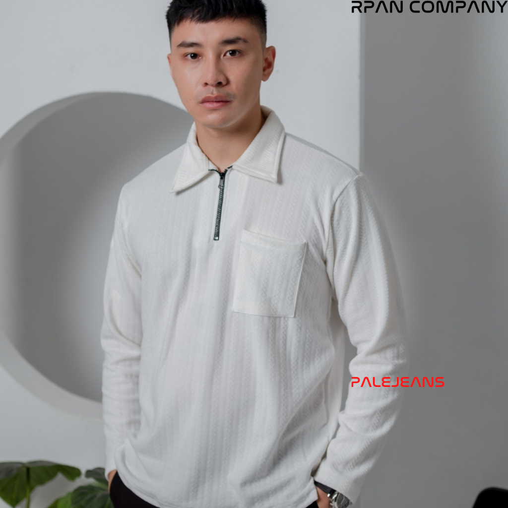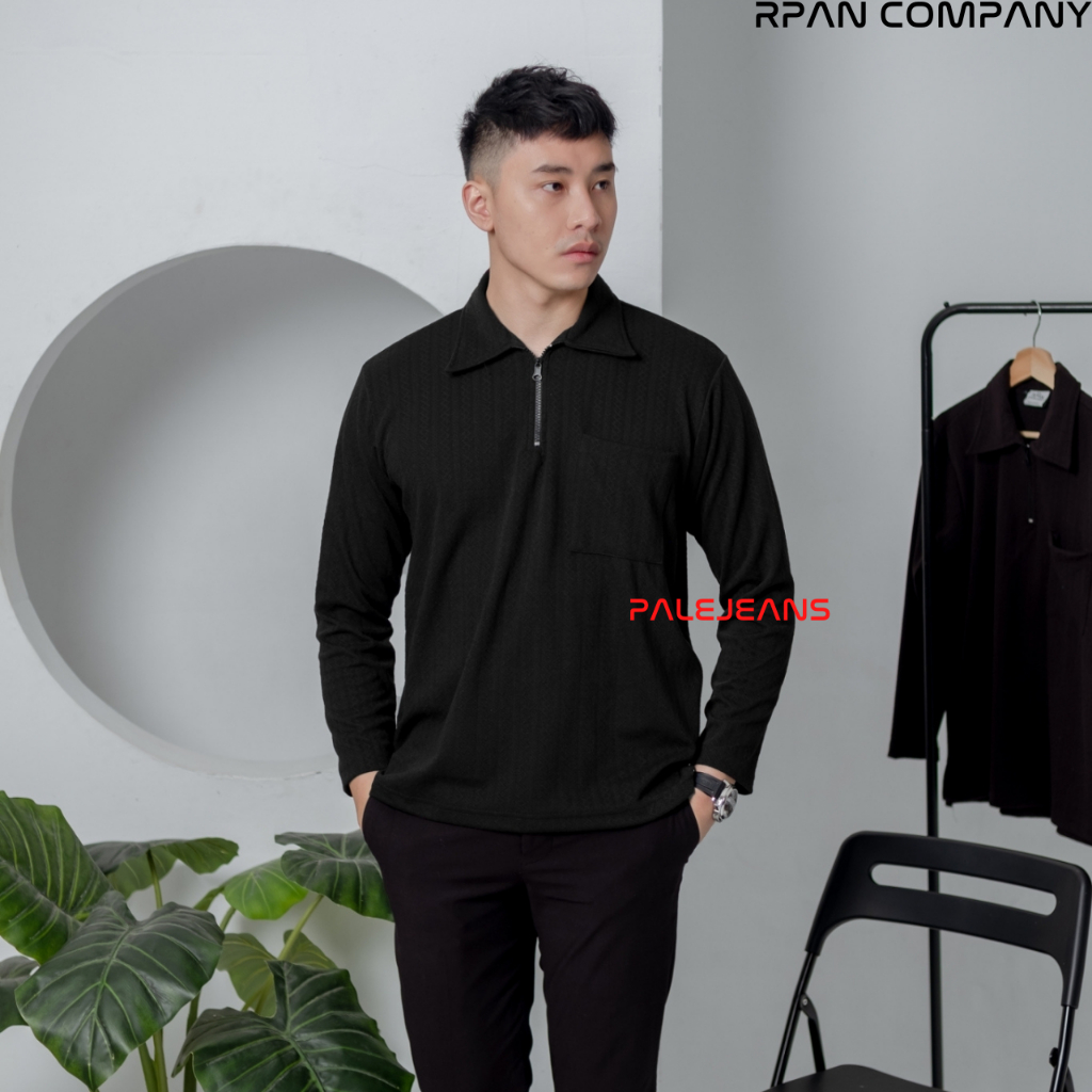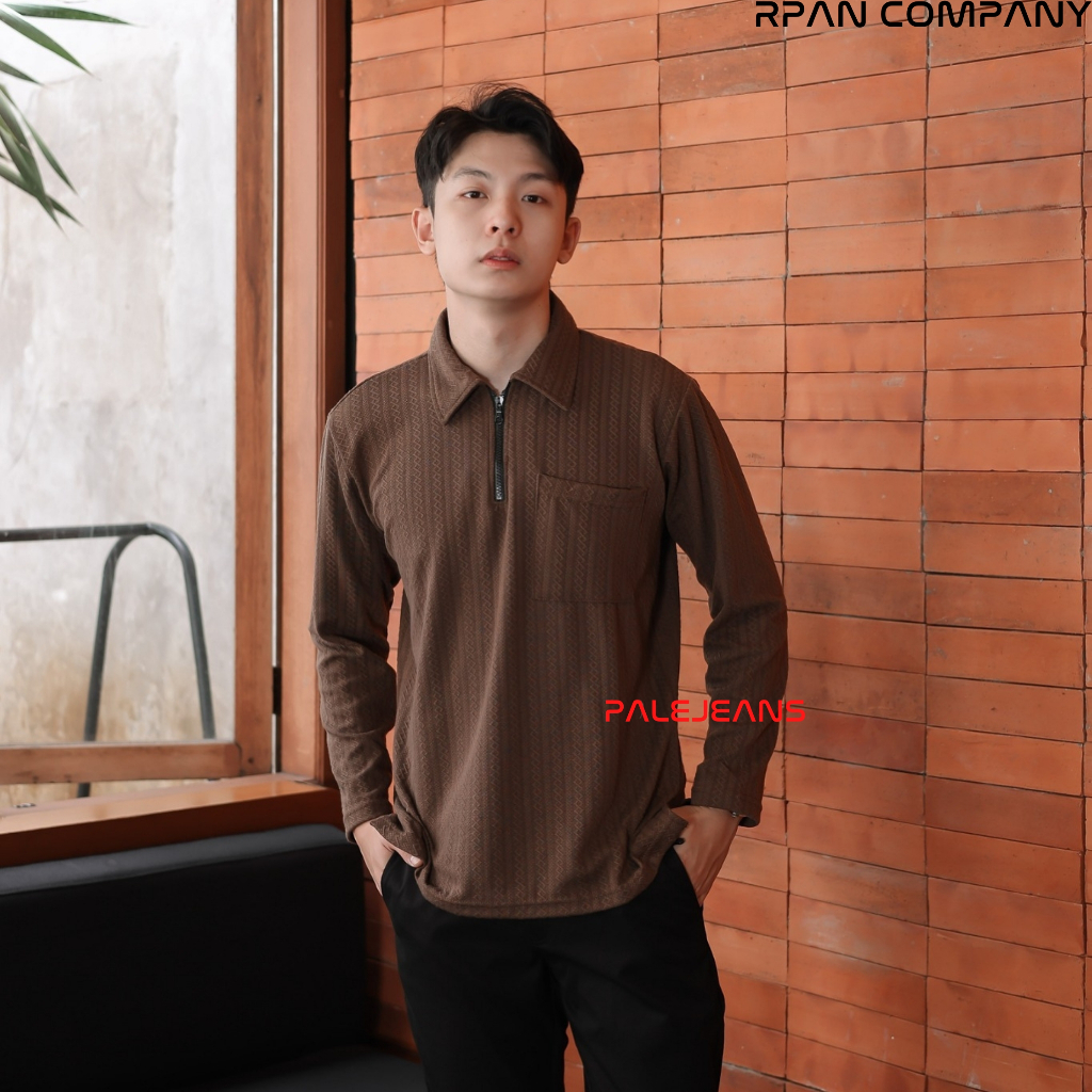Kaos Polo Knit Pocket Lengan Panjang Motif Pria / Polo Zipper Long Sleeve Knit Fabric / Kaos Tangan Panjang Saku Modern