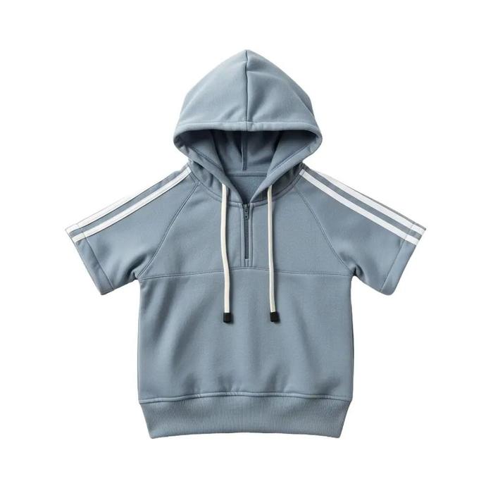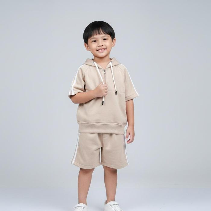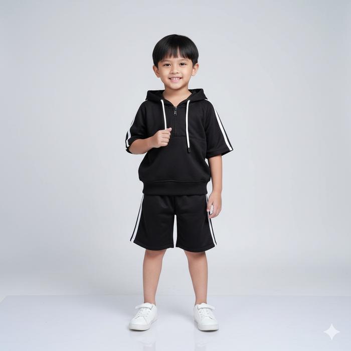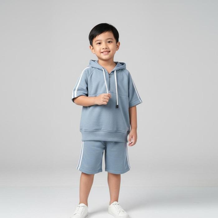 Montana | Setelan Fashion Anak Cowok Cewek Short-Sleeve Zip-Up Hoodie Celana Pendek Garis Bahan Fleece Anak Makin Keren