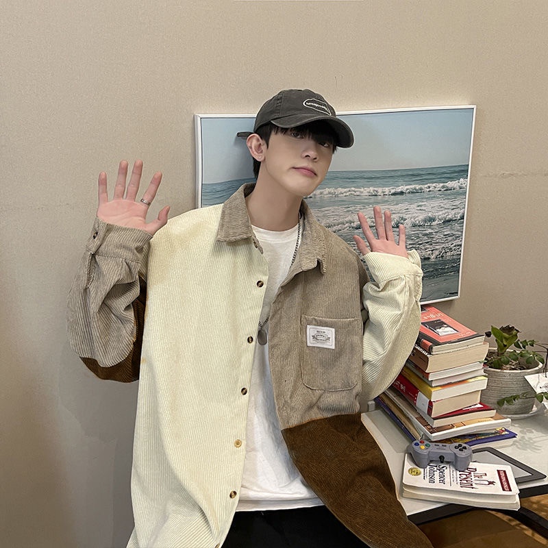 Kemeja Korduroi Retro Jepang Pria Longgar Tren Kemeja Jaket Atasan Lengan Panjang