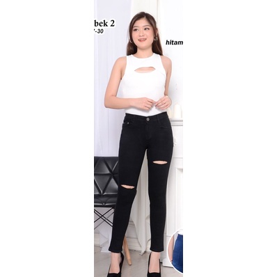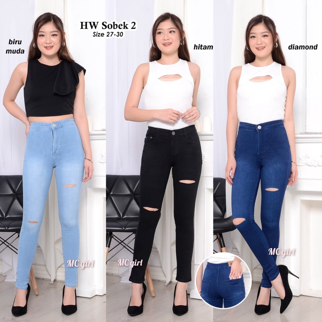 High Waist Sobek Garis Dua / Highwaist Lepis Ripped Tembus / Highwais Denim Koyak 2 / Haiwes Riped Tidak Ada Lapisan Wan
