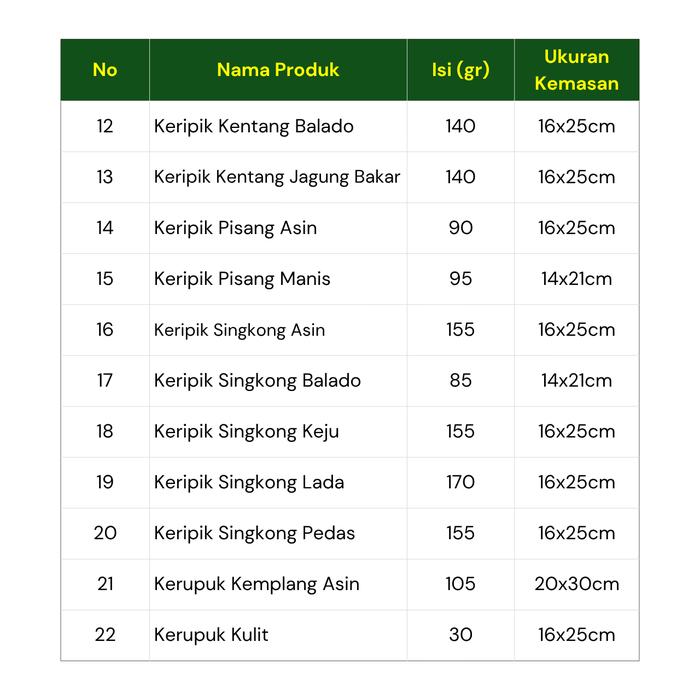 Biskuit Gemrose, Coco Crunch, Emping Jagung, Jagung Marning, Kacang Umpet Manis, Kacang Sangrai, Keripik Bawang, Keripik Kaca Asin, Keripik Kaca Pedas, Keripik Kentang Balado