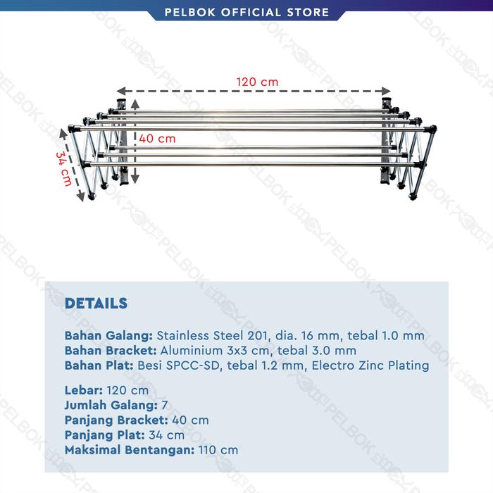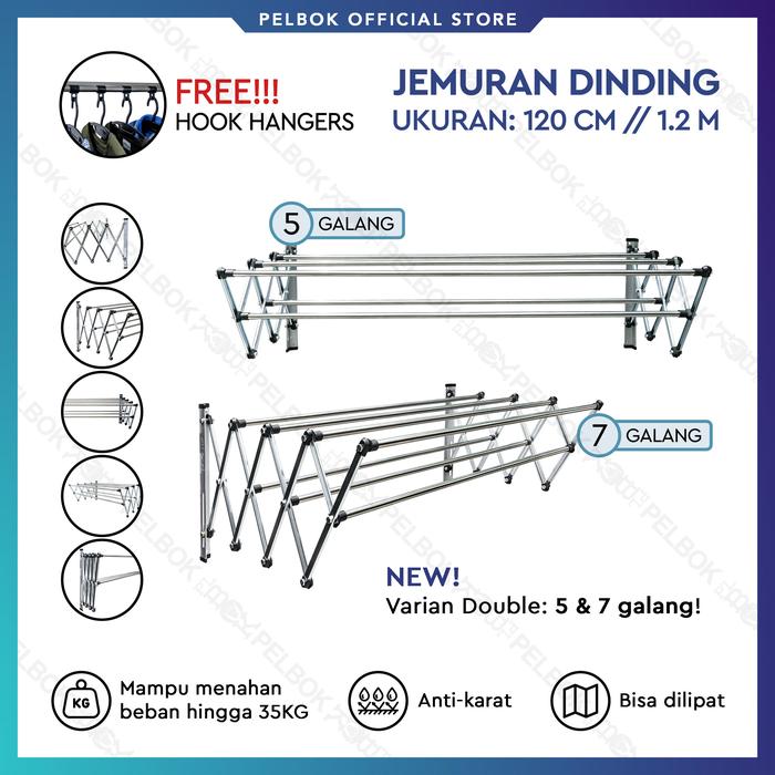 Pelbok Jemuran Baju Dinding Lipat Double 120 Cm Stainless Anti Karat - 5 Galang