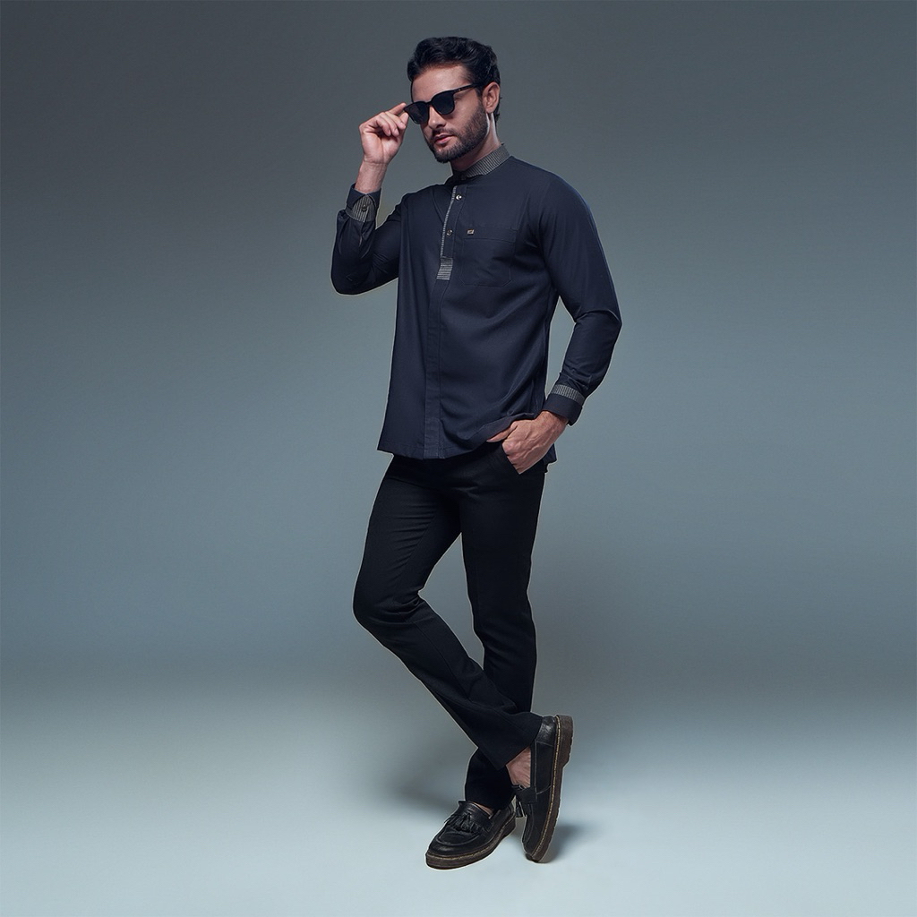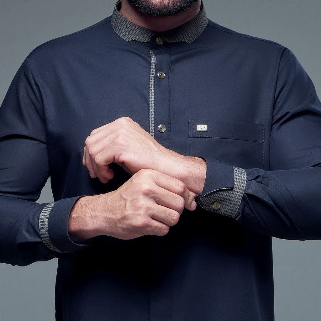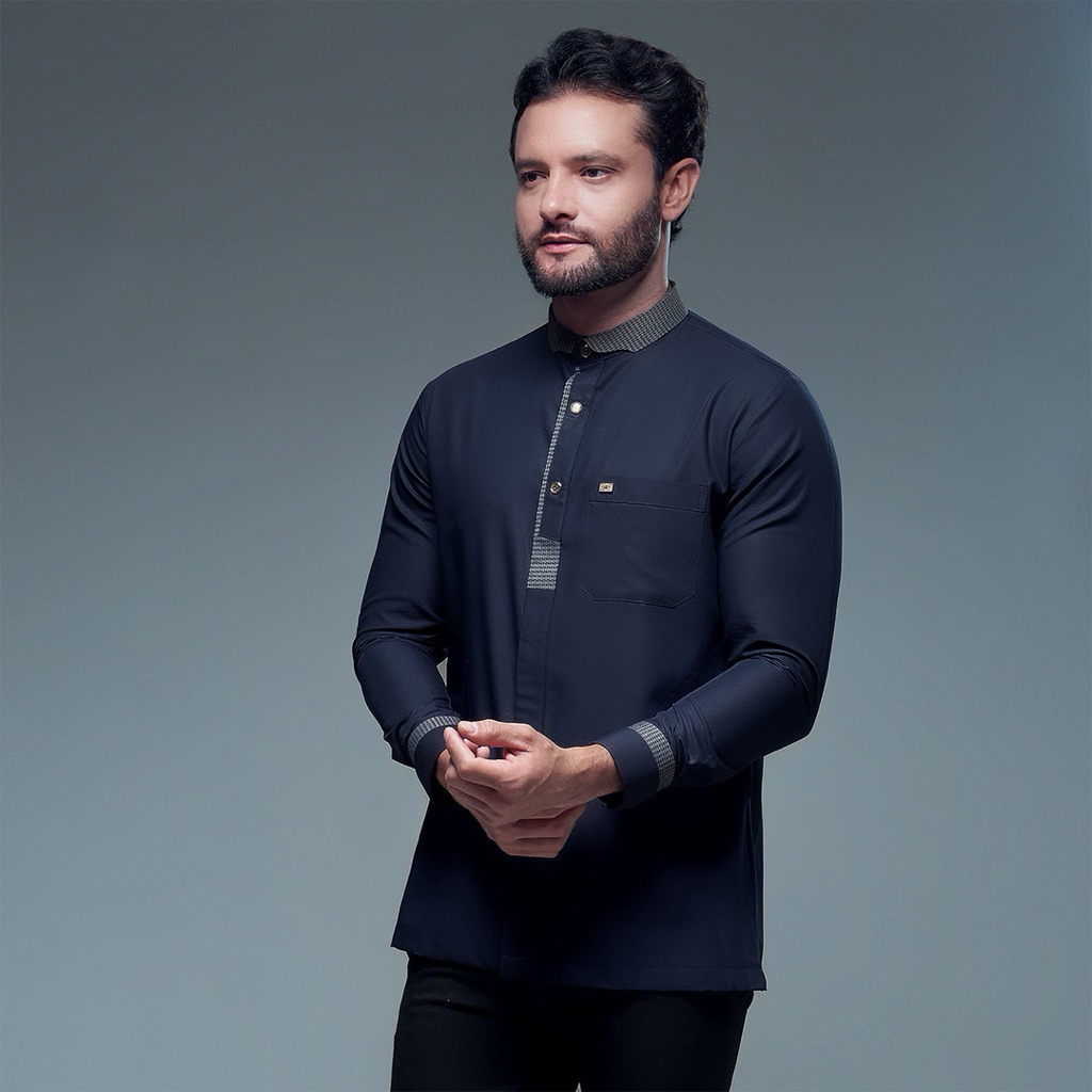 AZLAN Indonesia - Kemeja Koko Pria Shaheen Full Sleeve Dark Nevy | Fashion Muslim Pria Kemeja Koko Lengan Panjang AZ16