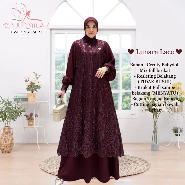 Lunarra Lace Baju Gamis Raya Wanita Muslimah Bahan Ceruty Babydoll Mix Brokat Mewah Elegan Pesta