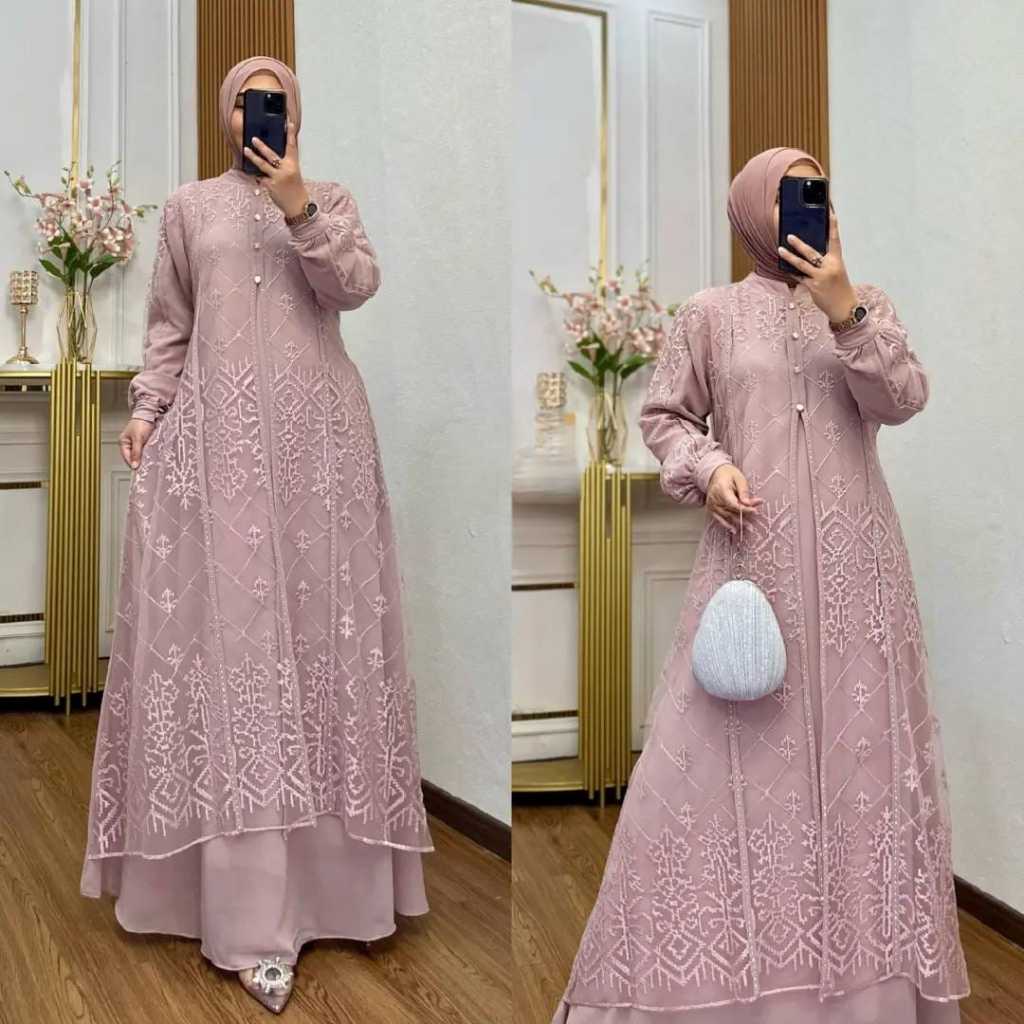 Dress Mahogany Denara Bahan Ceruty Armany Mix Brukat Aplikasi Swarovski Baju Pesta Mewah Viral 2025