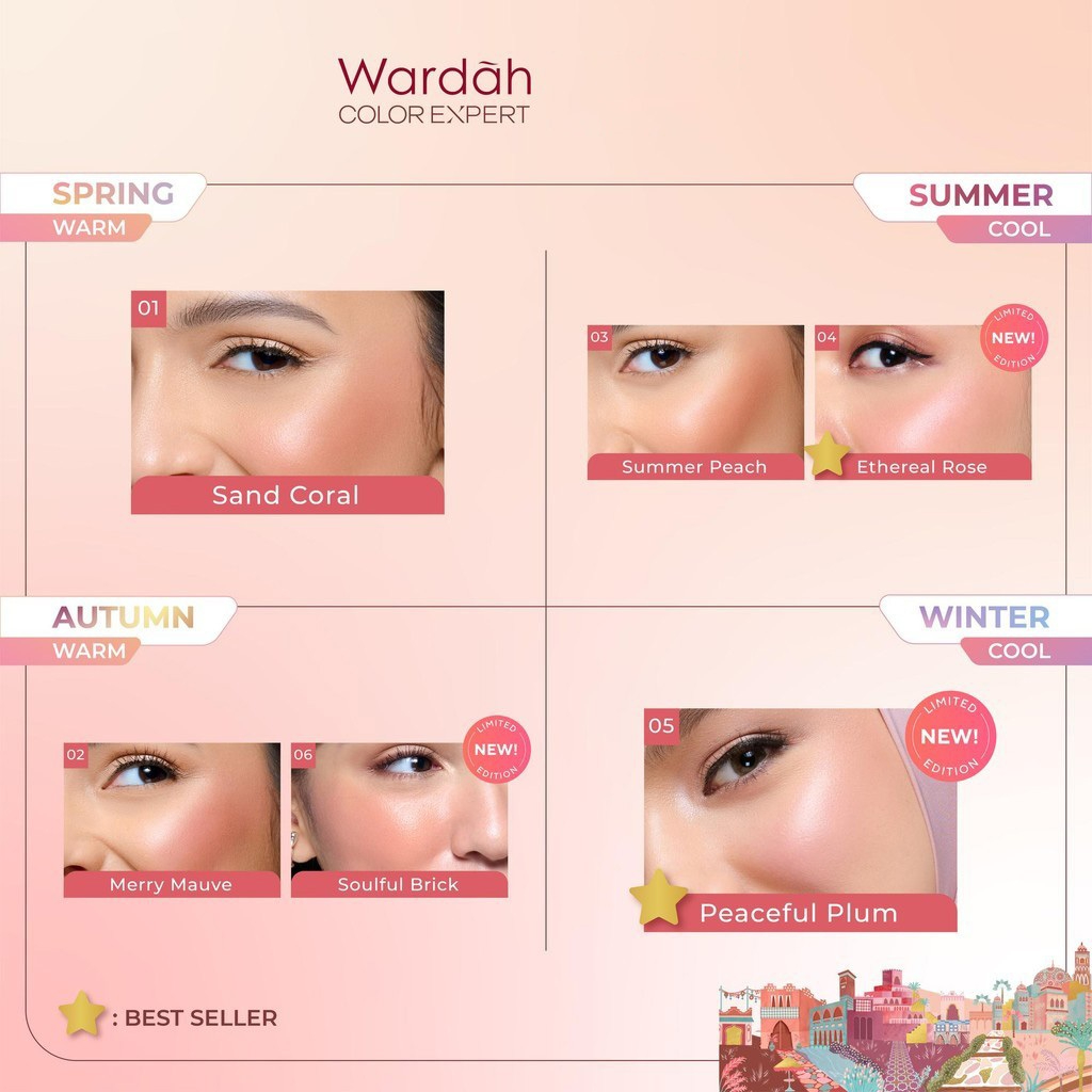 01 SAND CORAL, 02 MERRY MAUVE, 03 SUMMER PEACH, 04 ETHEREAL LOVE, 05 PEACEFUL PLUM, 06 SOULFUL BRICK, BLUSH 01+CUSHION 32N, BLUSH 01+CUSHION 23W, BLUSH 01+CUSHION 31W, BLUSH 01+CUSHION 41W