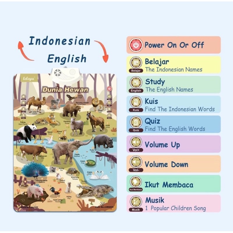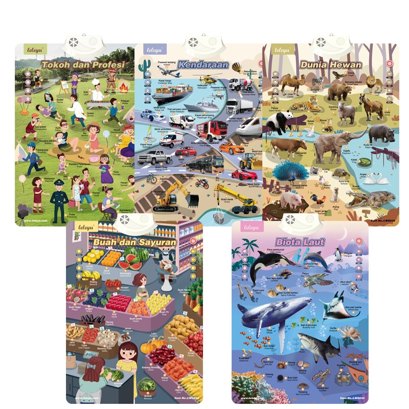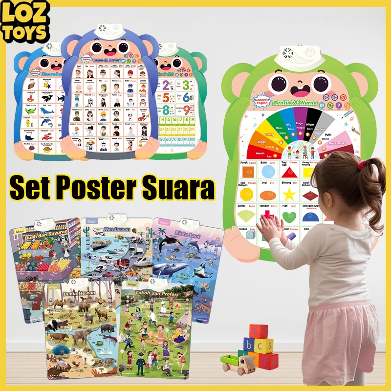 LOZTOYS 3 PCS Poster Anak Suara Bahasa Indonesia Inggris Arab / Bagan Dinding Audio Bilingual / Poster Edukasi Anak Suar