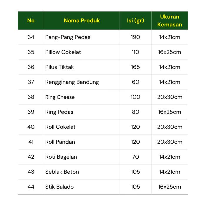 Biskuit Gemrose, Coco Crunch, Emping Jagung, Jagung Marning, Kacang Umpet Manis, Kacang Sangrai, Keripik Bawang, Keripik Kaca Asin, Keripik Kaca Pedas, Keripik Kentang Balado