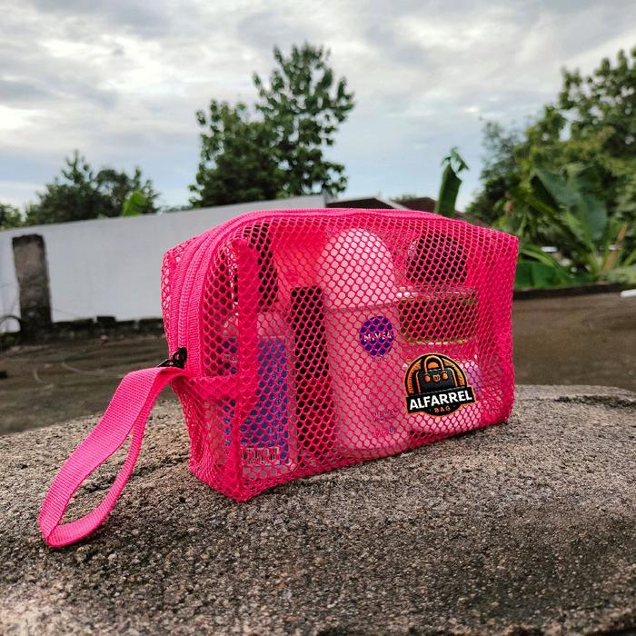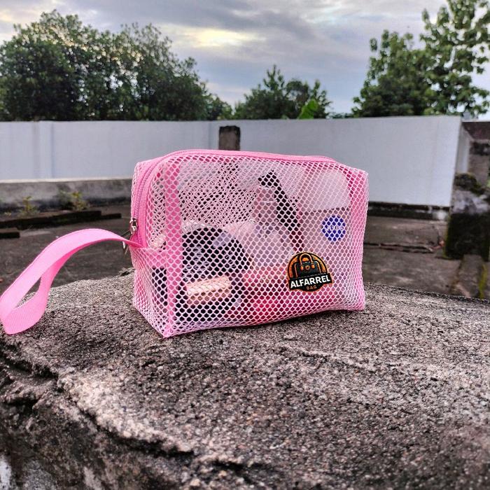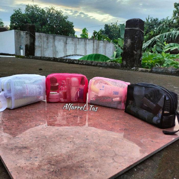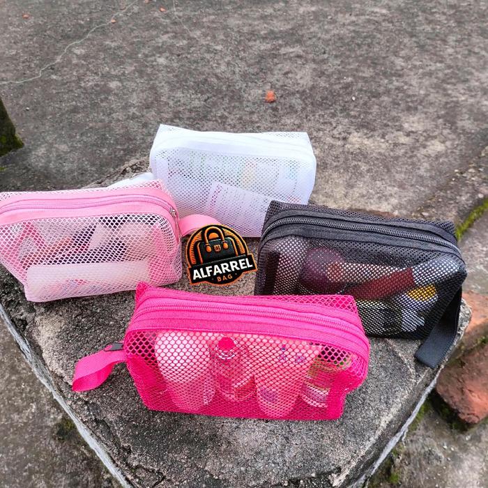 Tas Pouch Make Up Transparan Jaring Polos Tas Kosmetik Travel Bag Organizer New Size M Warna Pink Hitam Putih Real Pict