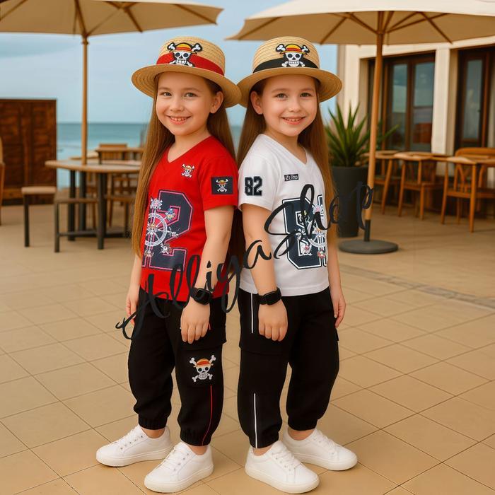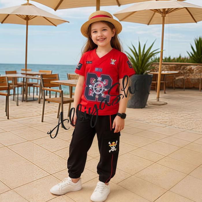 One Set Anak Perempuan Jersey Model One Piece Celana Cargo Joger 3-12 Tahun - Merah, Size 43-4 Tahun