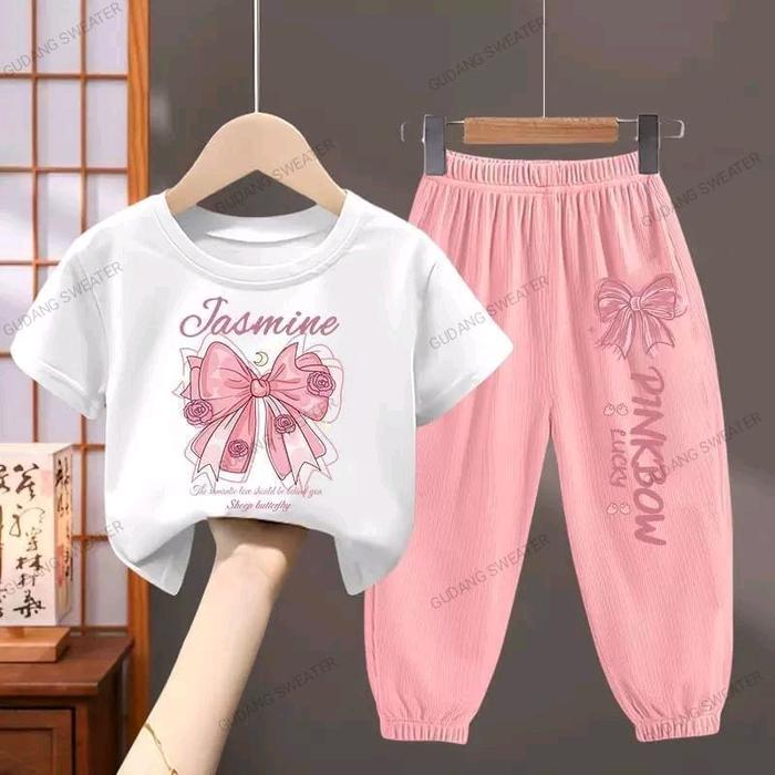 Baju Setelan Joger Anak Perempuan 1-10 Th Celana Joger Dan Kaos Oblong Jasmine Pita Anak-Anak - Putih, S 1-2 Tahun