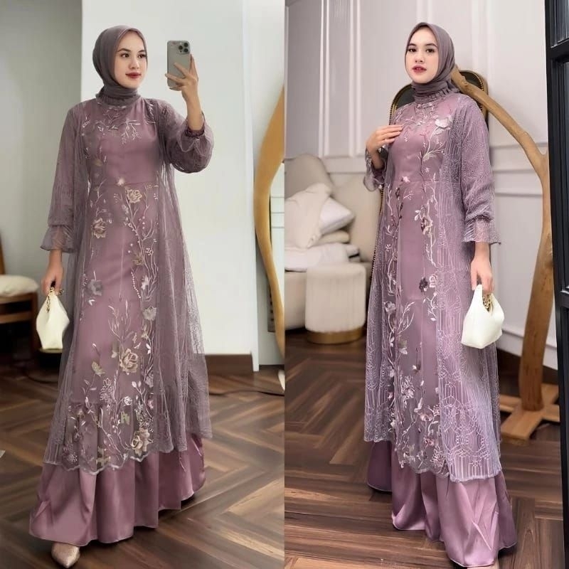 Free Hijab - ADA JUMBO Special Price ZEYA Dress Set ( Dress + Tunik Blouse Lace ) Dress Terbaru / Gamis Kondangan / Dress Pesta Tile Premium / Gamis Pesta Tile