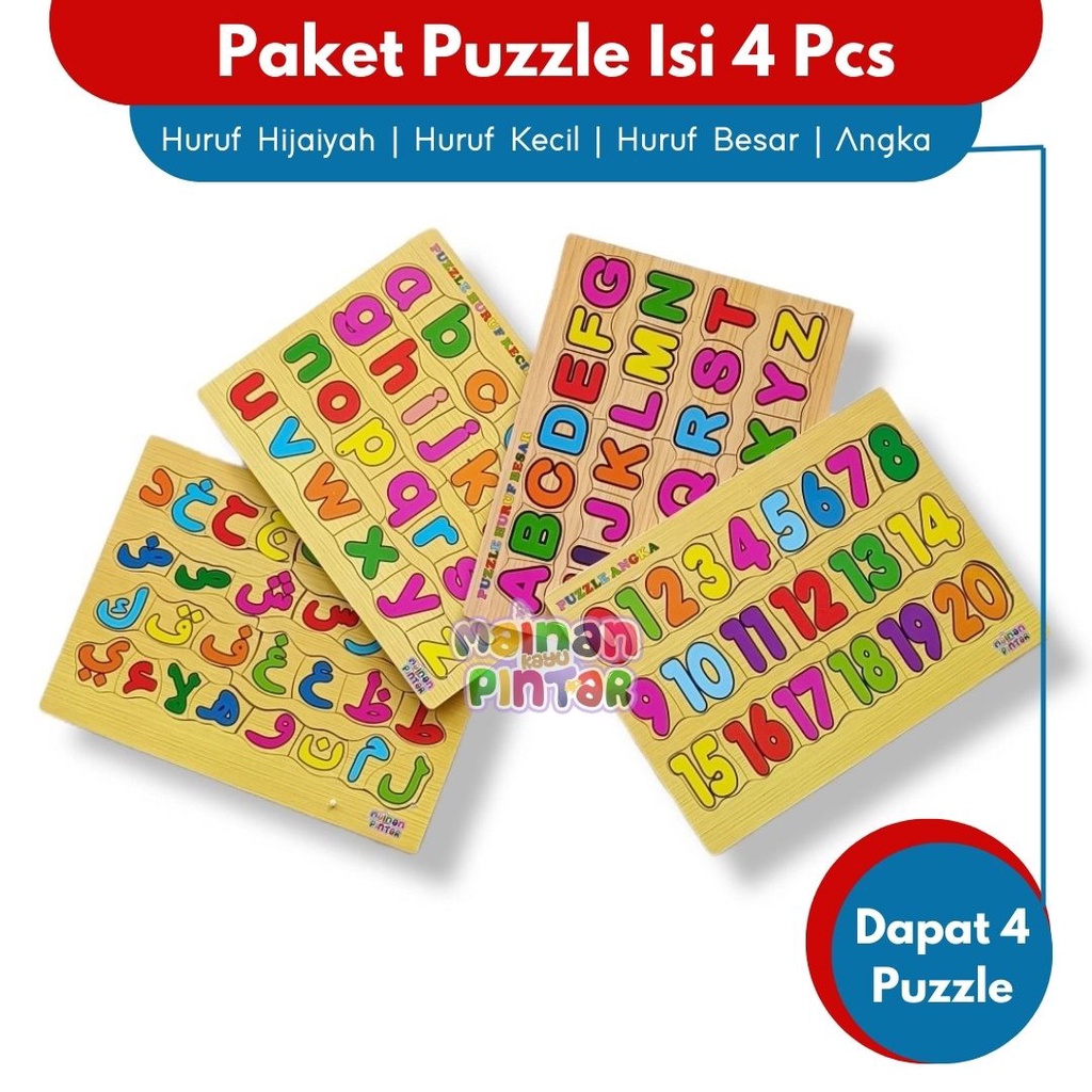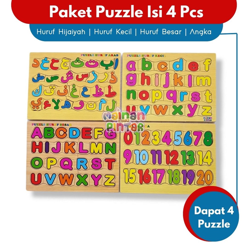 Puzzle Kayu Isi 4 Huruf Hijaiyah Arab Huruf Besar Kecil Angka 0-20