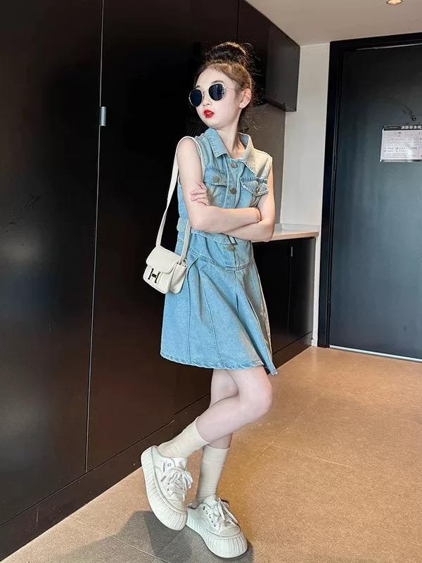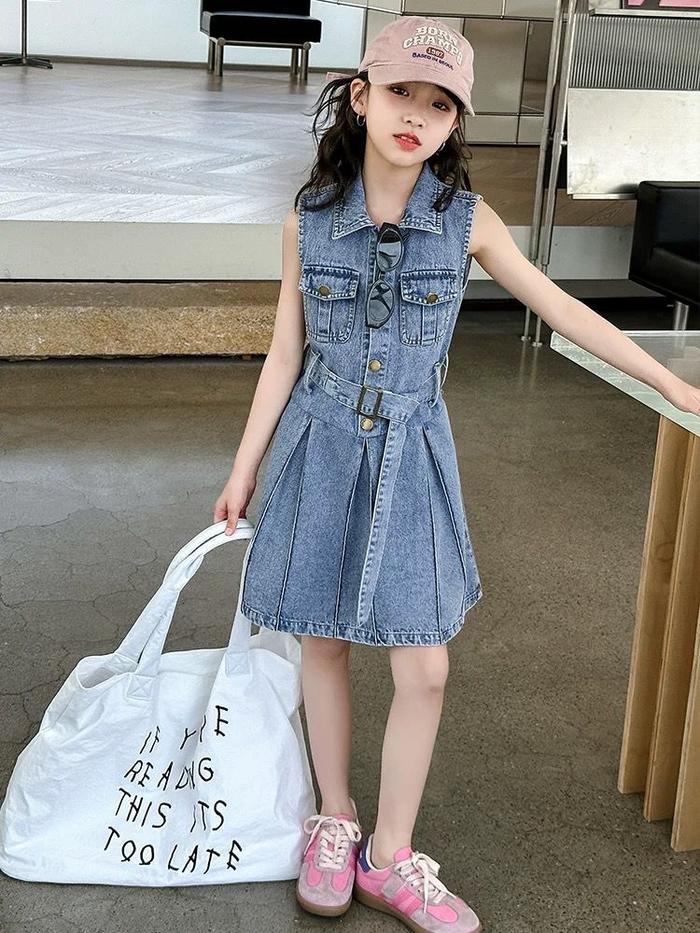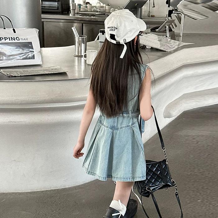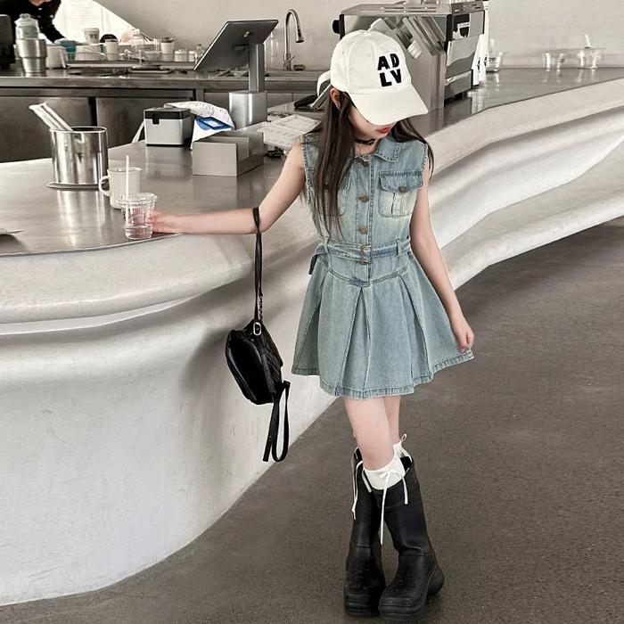 Kidsfashionkoleksi 1071 Dress Denim Belted Remple Button Anak Perempuan - Ash Denim, 90Cm