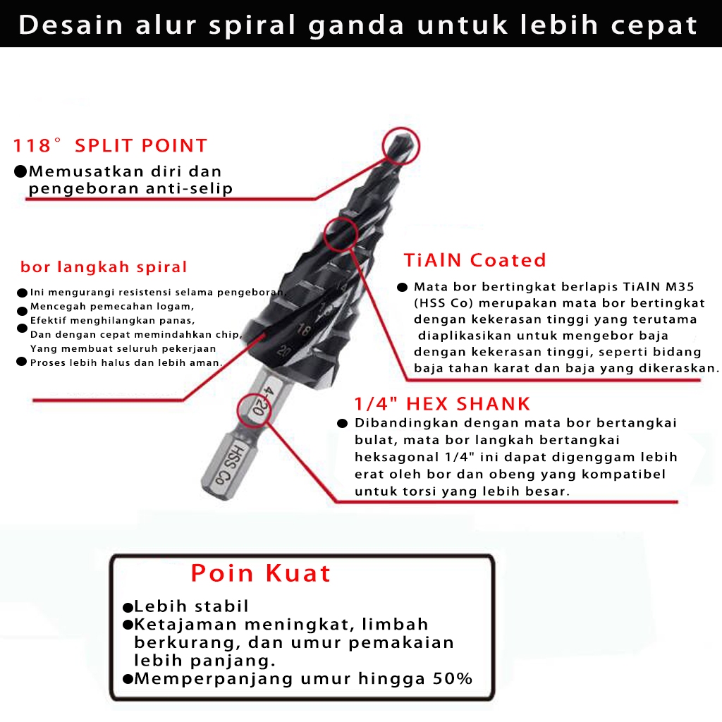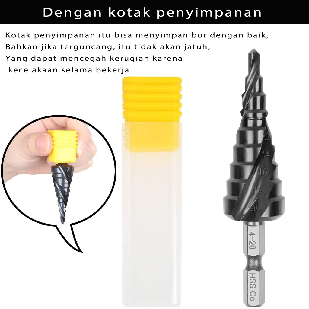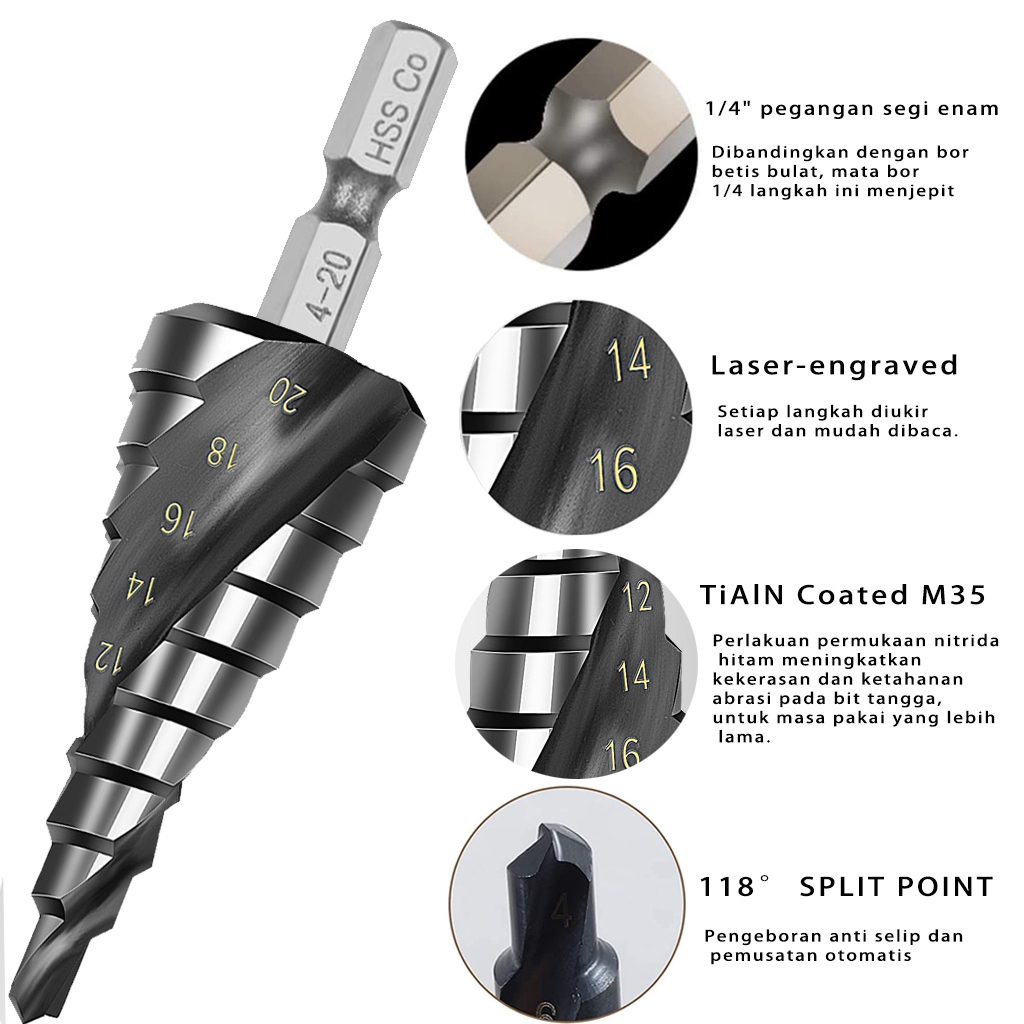 Bor Bit Untuk Stainless Steel Hss-Co M35 Tialn Dilapisi Langkah Bor 1/4" Hex Shank 4-20Mm