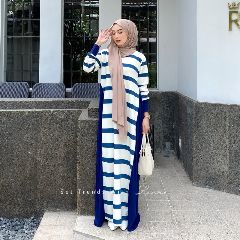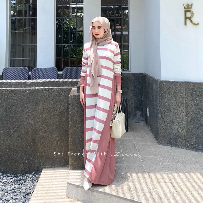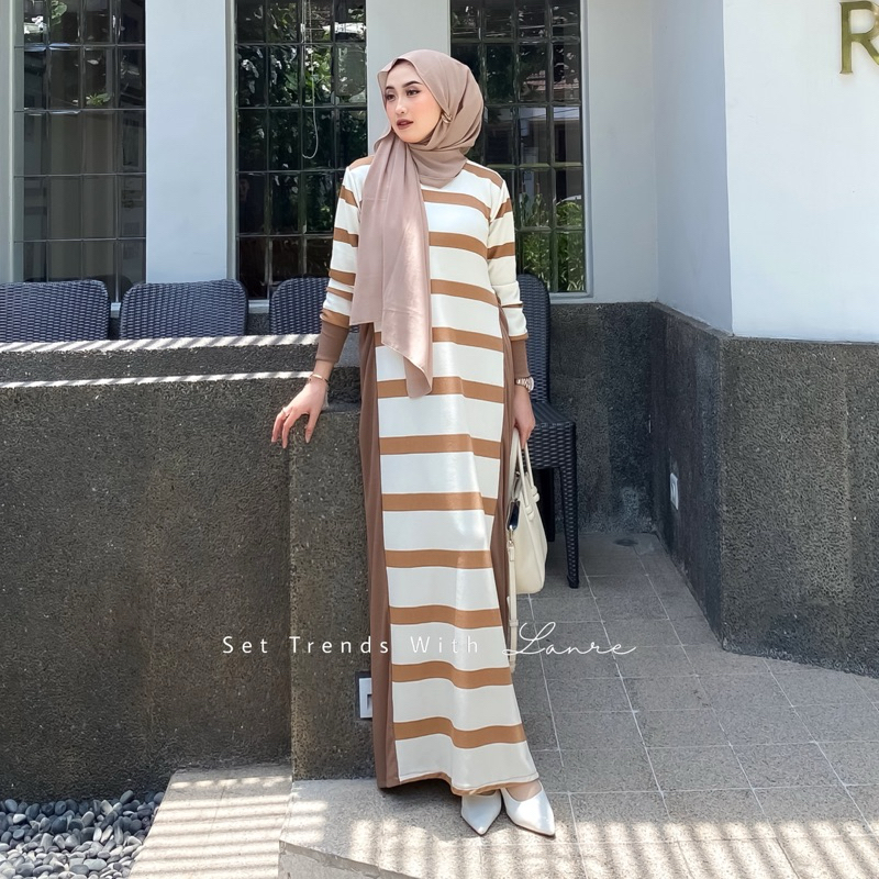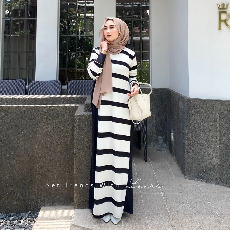 Viona Dress Motif Strip Hitam By Lanre Gamis Dengan Kesan Anggun Berbahan Knit Lembut