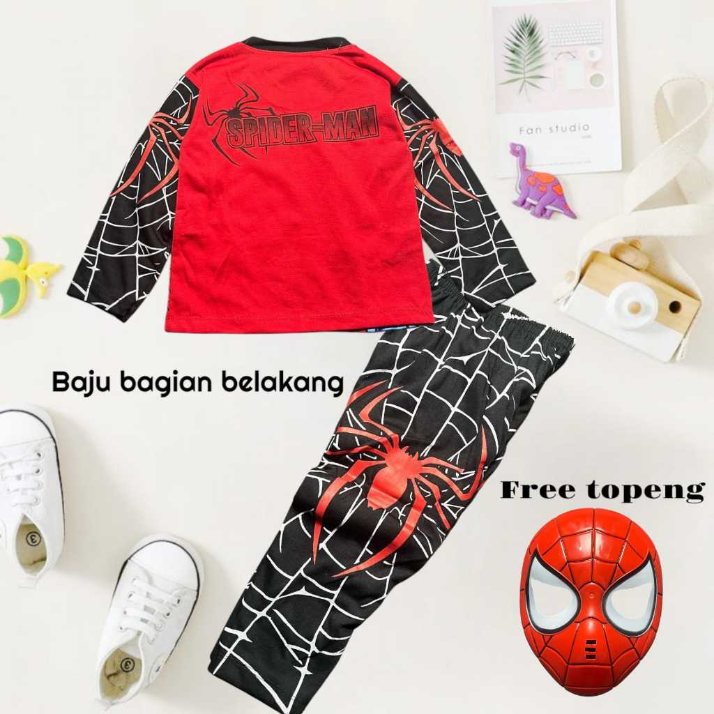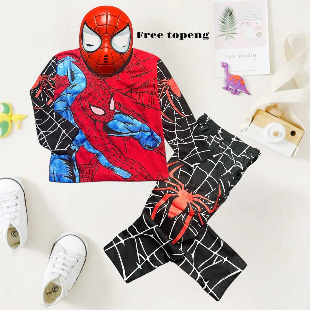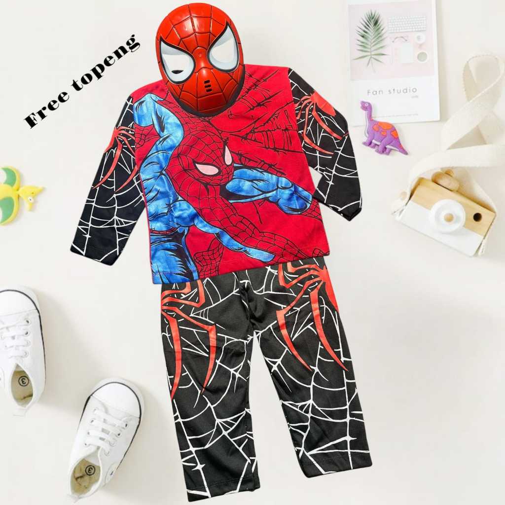 Baju Stelan Anak Laki-Laki Lengan Panjang Motif Spiderman Bahan Katun Usia 1-10 Tahun Free Topeng