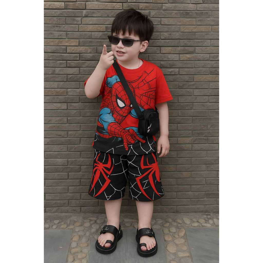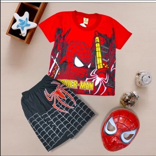 Setelan Anak Laki Laki Lengan Pendek Bergambar Spiderman Free Topeng Usia 1-7 Tahun Bahan Katun