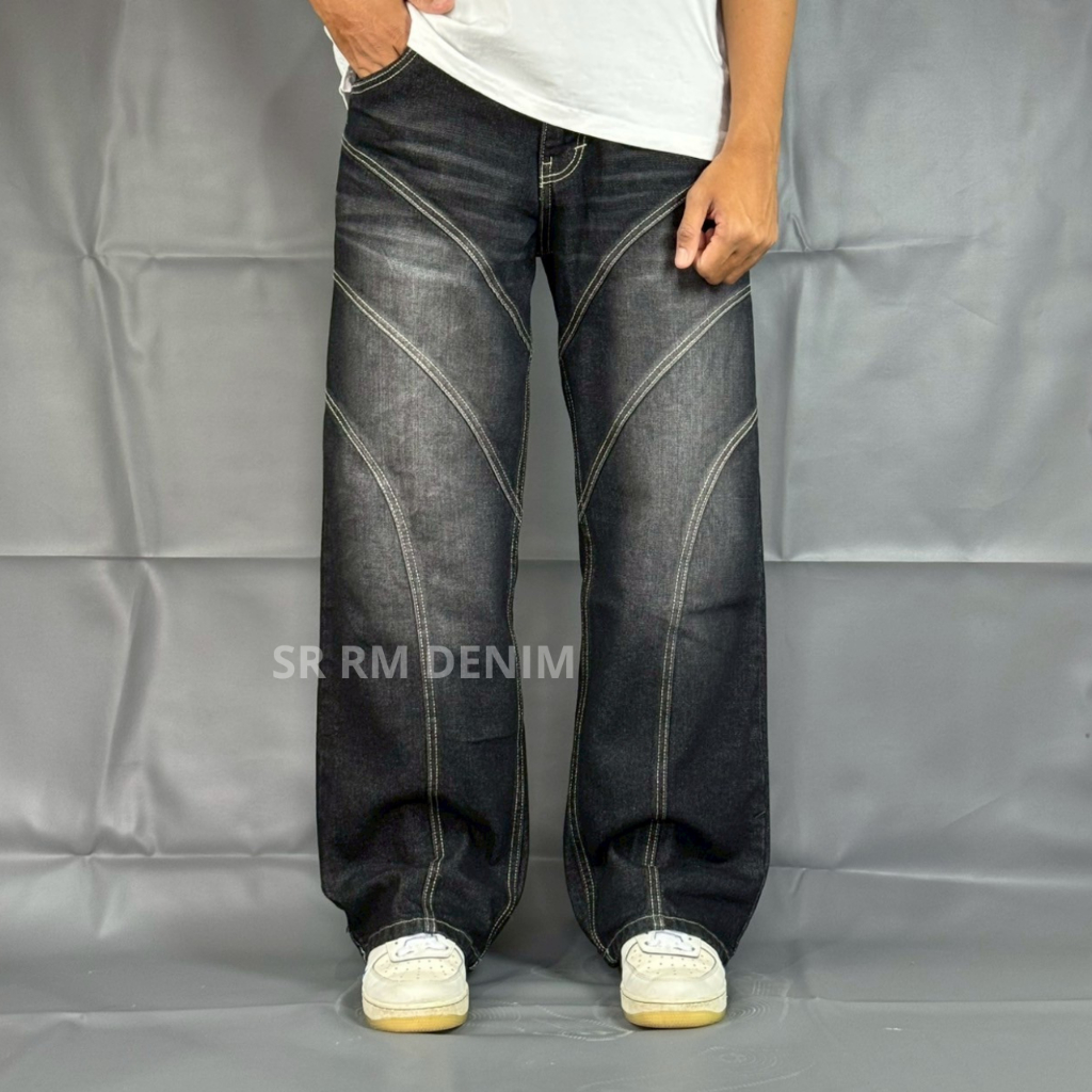 Celana Panjang Jeans Denim Baggy Pecah Pola Garis 3 Black Jazz/Brownting Pria Dewasa