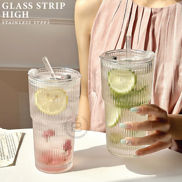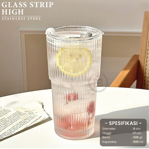 AESTHETIC TUMBLER GLASS STRIP HIGH 550ML STRIPED CANTIK SUSU MILK COFFEE KOPI CAFE YO-REUM KOREAN ELEGANT BIG SIZE TEBAL MULTIFUNGSI KOREA DENGAN TUTUP PLASTIK