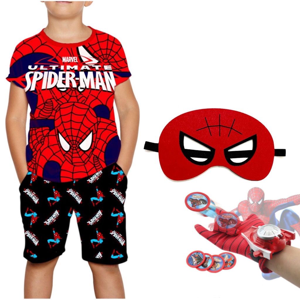 Stelan Pendek Anak Laki-Laki Baju Spidermen Lengkap Dengan Topeng Dan Mainan Sarung Tembak Spaidermen