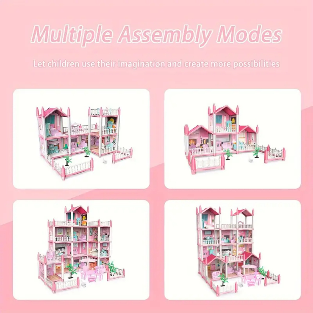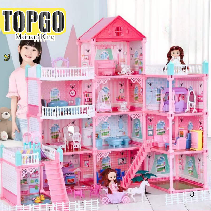 Mainan Anak Perempuan Rumah Boneka Besar 3D Princess Big Pink Villa DIY Doll House