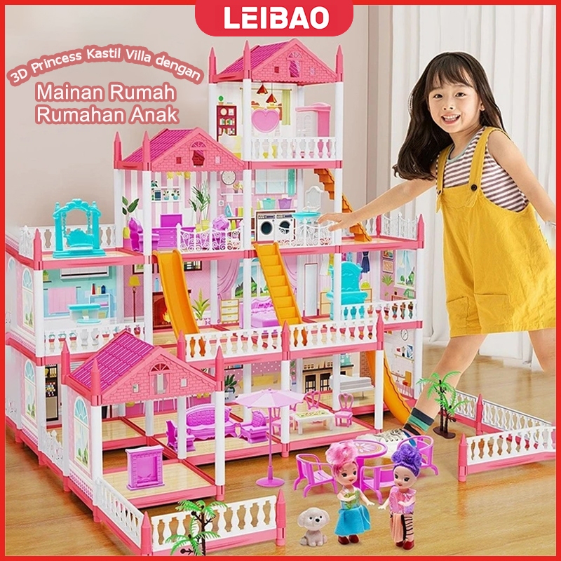 LEIBAO Mainan Rumah Rumahan Anak Perempuan 3D Princess Kastil Villa dengan Lampu dan Boneka Perakitan DIY Rumah Mainan