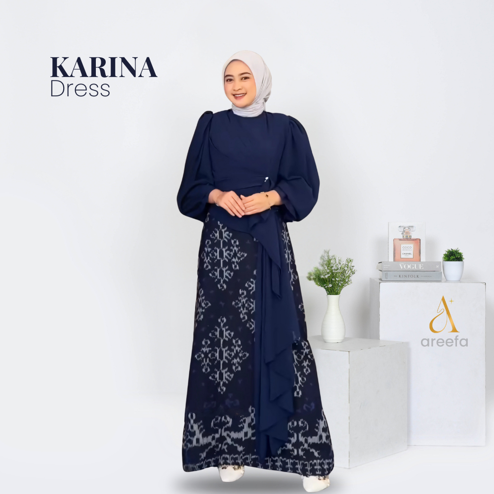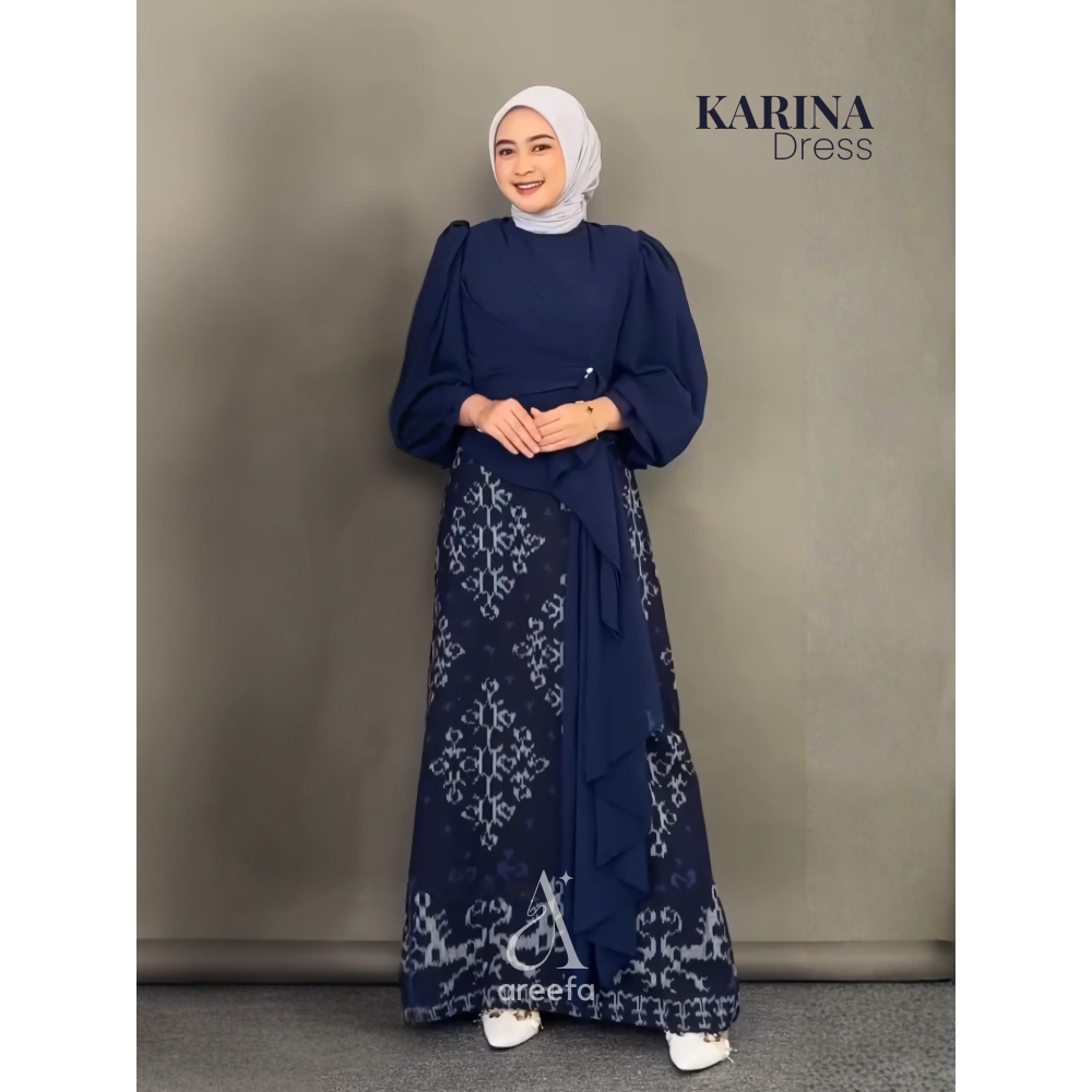 Areefa - KARINA Gamis Dress Tenun Etnik Kombinasi Ceruty Premium Wanita Remaja Pesta Mewah Navy