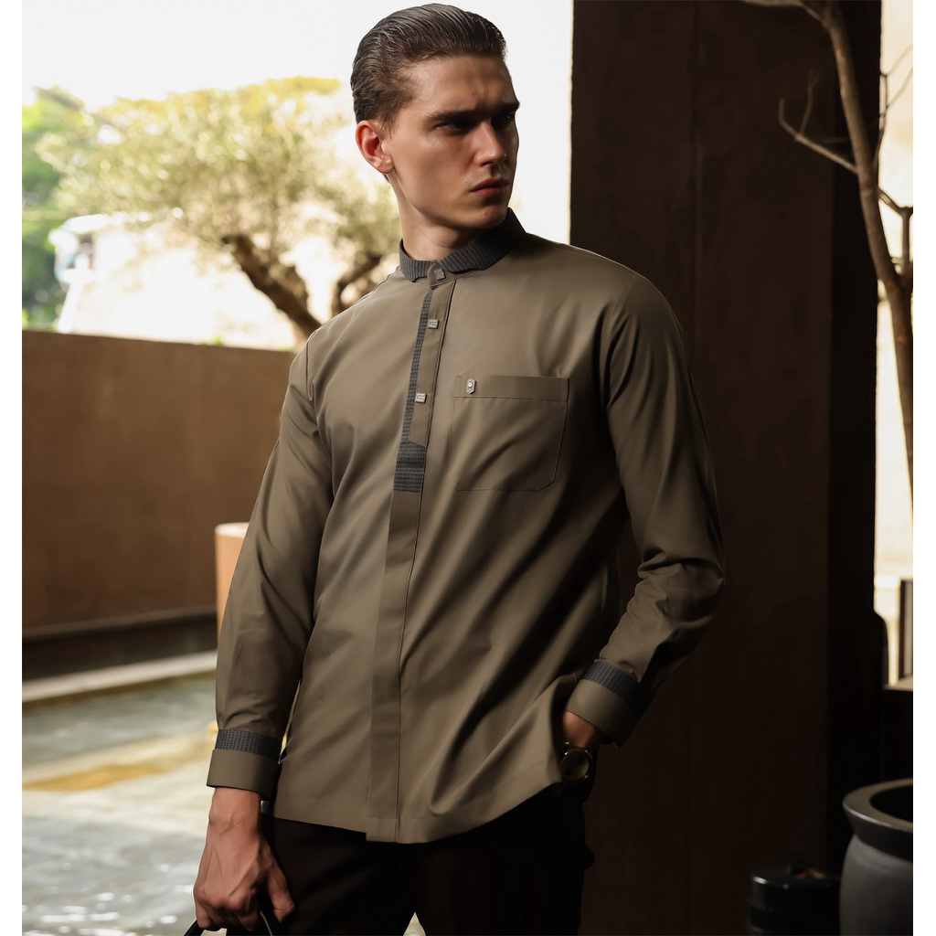 AZLAN Indonesia - Kemeja Koko Pria Shaheen Full Sleeve Olive Green | Fashion Muslim Pria Kemeja Koko Lengan Panjang AZ16