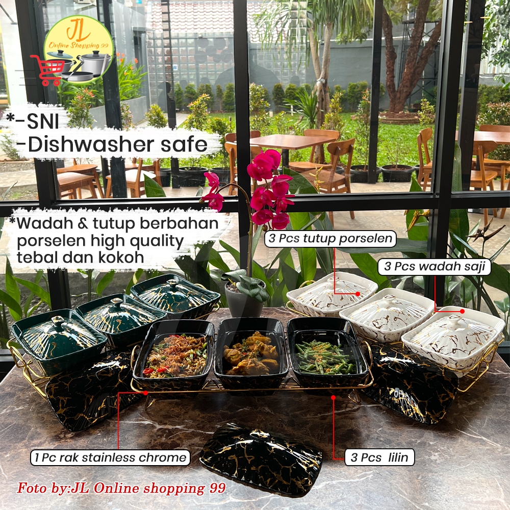 Fiorenza 7Pcs Prasmanan Set Segi + Tutup + Rak Motif Marble Duluxe Series Keramik Type 988 / Food Warmer / Premium Casse